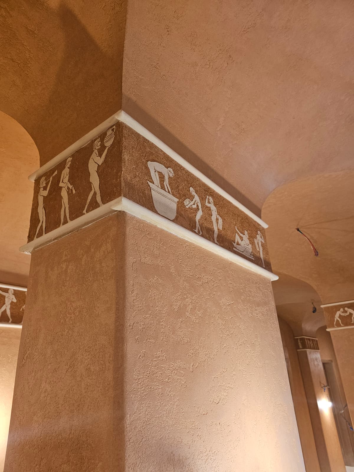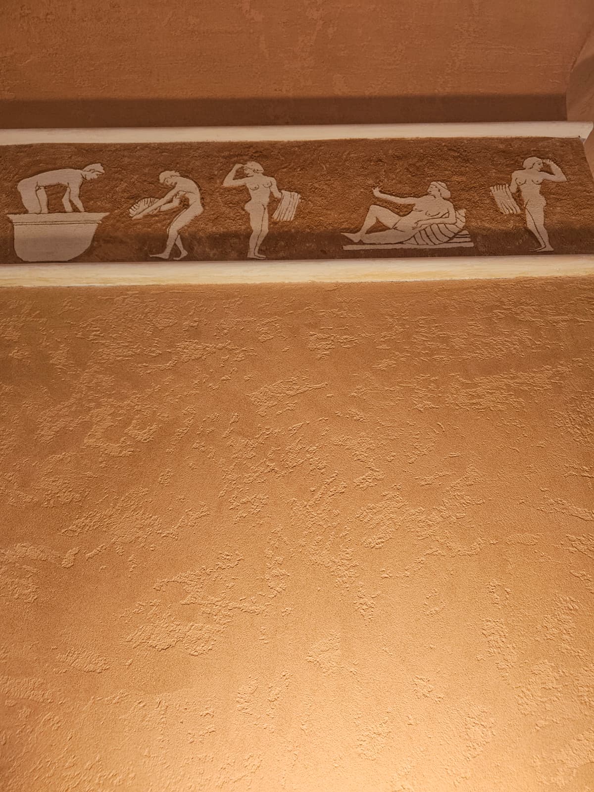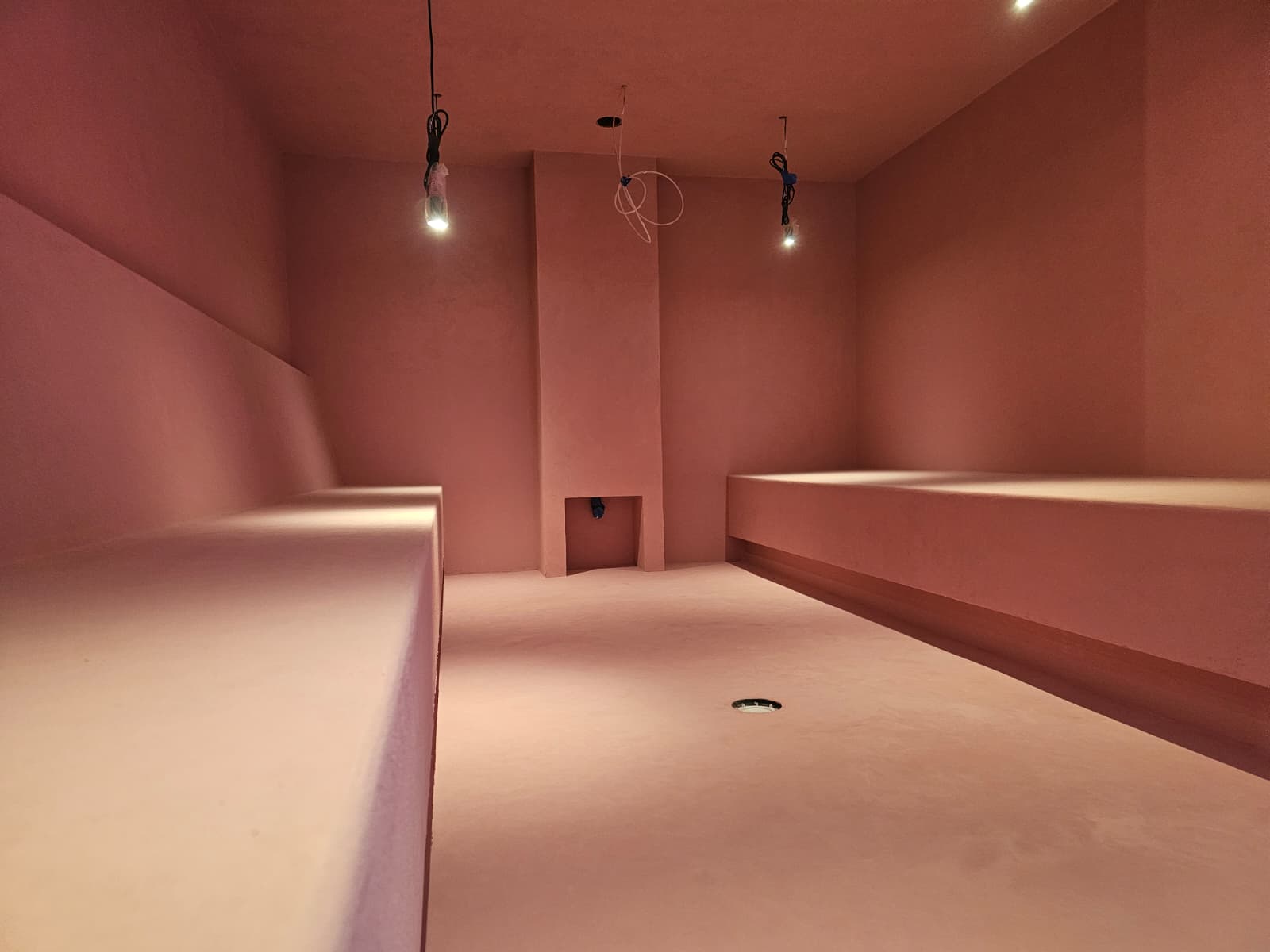 Once the base had cured sufficiently, we applied the microcement finish layer by hand. This stage requires precision and craftsmanship, as microcement is a living material that reveals the trowel pattern and movement of the installer. For this spa, the chosen aesthetic was a soft, natural texture with minimal movement, promoting a calming, spa-appropriate atmosphere.